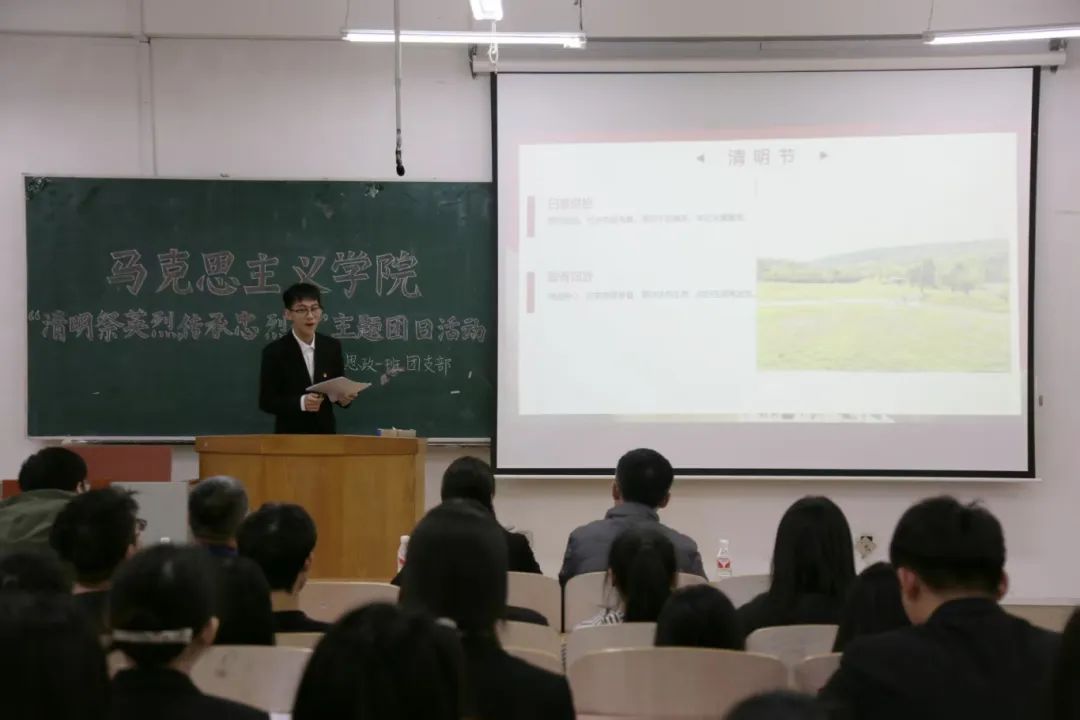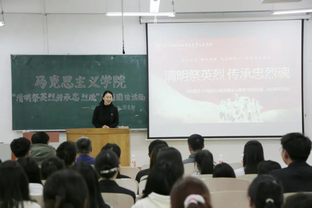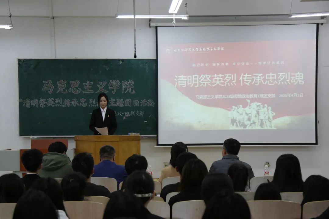 马克思主义学院新时代大学生理论宣讲团成员、2023级思想政治教育一班曲宏烨同学以“祭英烈承遗志,铭初心启新程”为主题开展宣讲,带领团员青年回顾历史,走进英烈们的精神世界。宣讲引发强烈共鸣,团员青年们纷纷表示要传承英雄"苟利国家生死以"的赤子情怀。