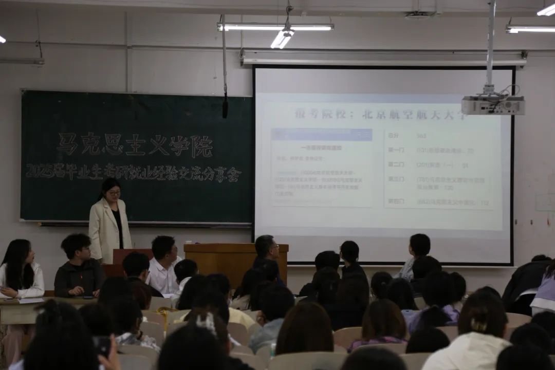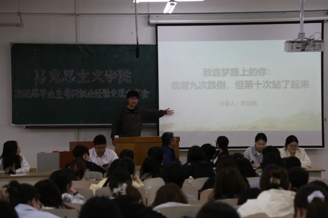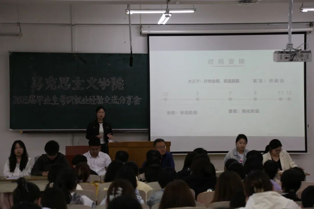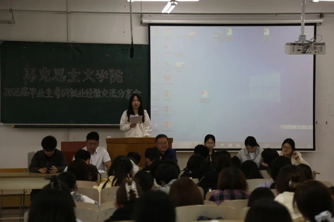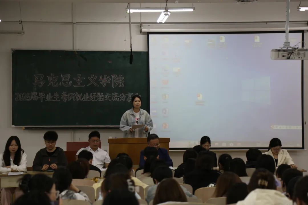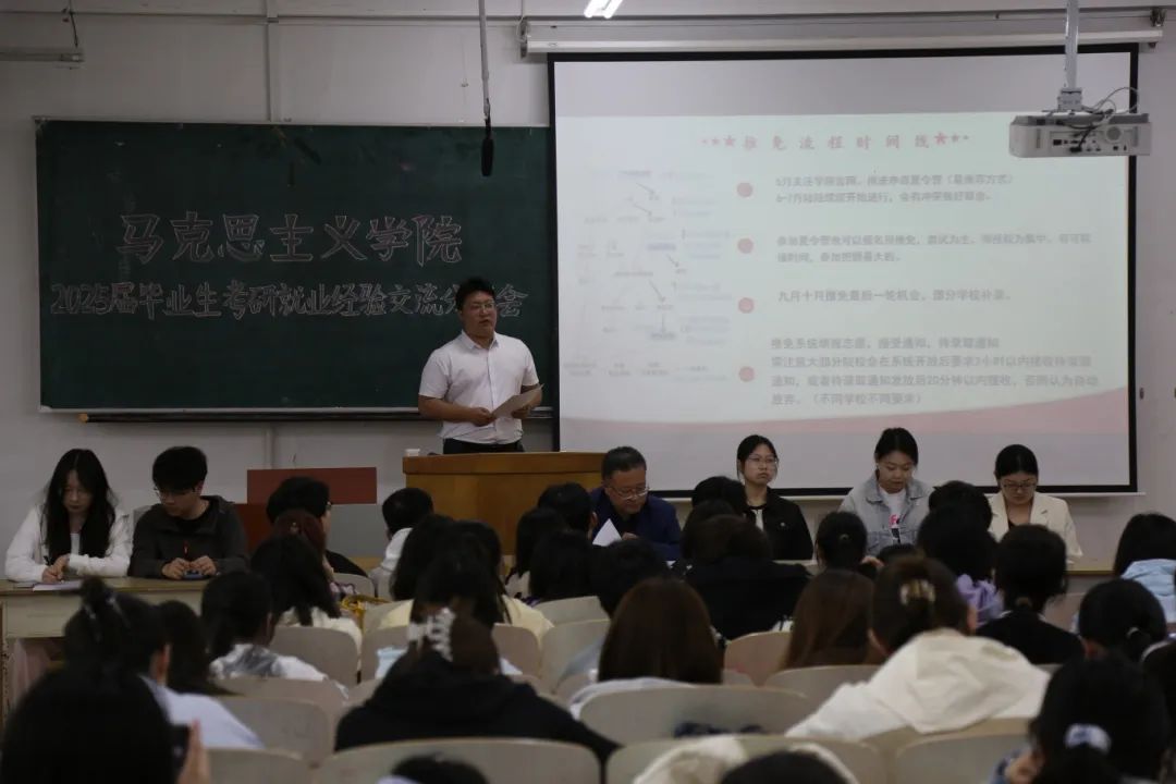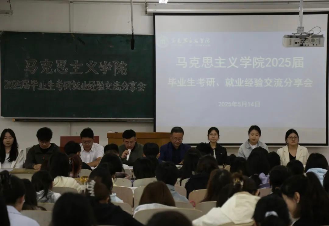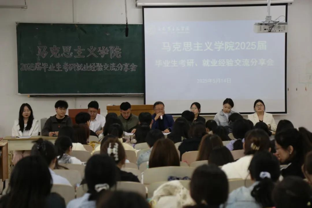 为充分发挥我院优秀毕业生榜样引领作用,助力学生明晰未来学业规划和职业发展路径,提振奋斗信心。 5月14日下午,马克思主义学院在社科楼201教室举办2025届毕业生考研、就业经验交流分享会,学院党委副书记孙鹏飞及2026届全体毕业生参加,分享会由副处级辅导员王铁石主持。