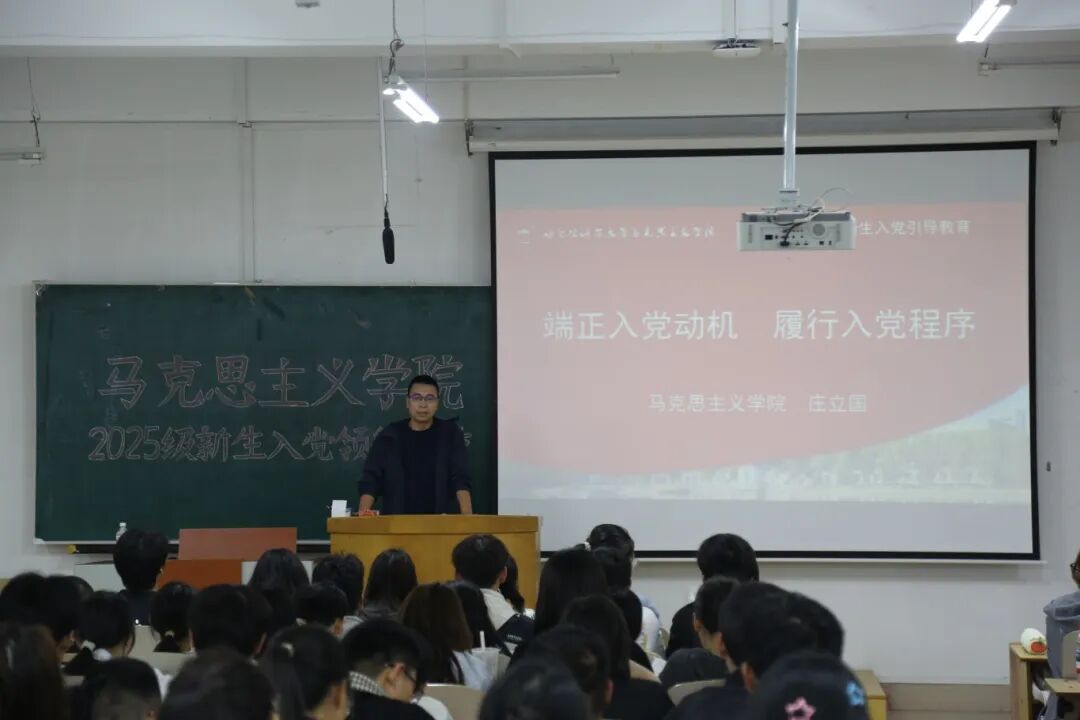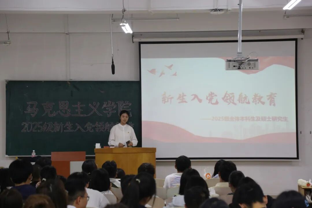 为进一步加深青年学生对党组织的认识,引导树立正确的入党动机,坚定共产主义理想信念,9月27日晚,马克思主义学院在社科楼201教室面向2025级新生举办入党领航教育。活动由学院组织员庄立国老师主持,学生党建指导中心主任宋子怡同学主讲,2025级全体本科生及硕士研究生代表参加。