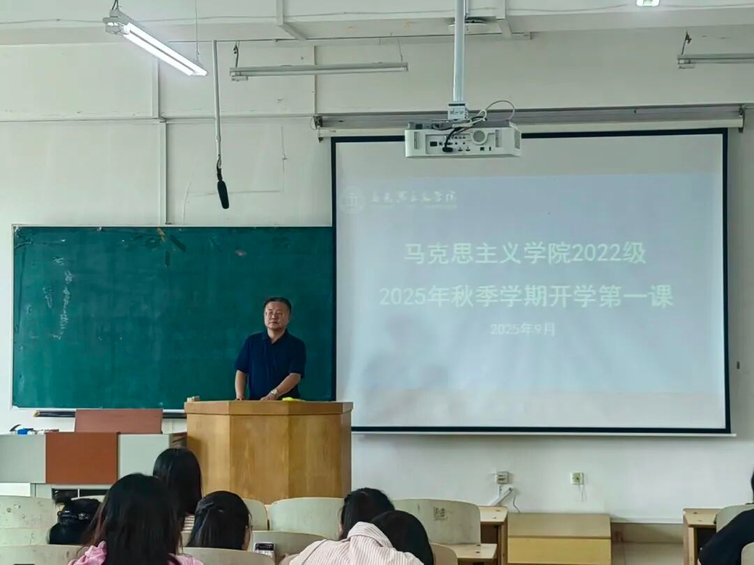 宋佳东书记以“怀抱梦想,脚踏实地,做新时代坚定的马克思主义者”为题,为2025级全体新生讲授开学第一课。他首先代表学院向新同学表示热烈欢迎,并详细介绍了学院的发展历程、办学特色以及在学科建设、人才培养等方面取得的突出成绩,增强了新生对学院的认同感和归属感。随后,他围绕“一个核心、两个目标、三个维度、四个路径、五个建议”展开系统阐述,引导学生树立正确的世界观、人生观、价值观,鼓励大家胸怀远大志向,科学规划学业,努力在知识的深度挖掘、广度拓展与高度提升上持续发力,实现学思用贯通、知信行统一,成为马克思主义的坚定信仰者、积极传播者和模范践行者。