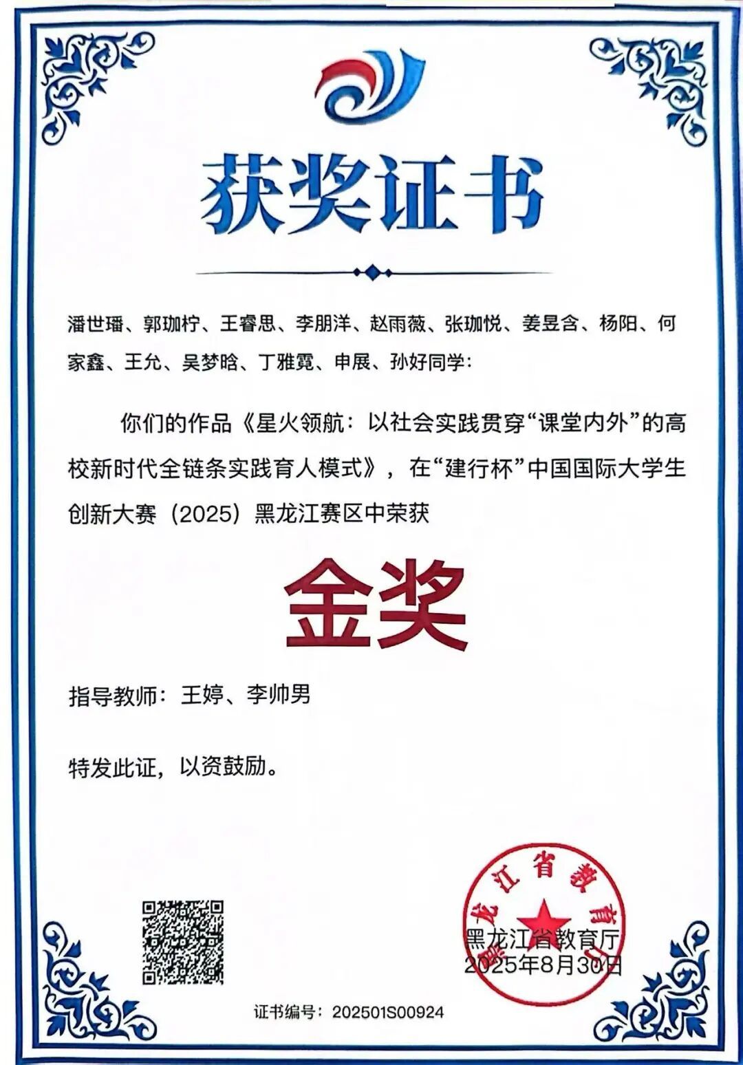 近日,省教育厅公布“建行杯”中国国际大学生创新大赛(2025)黑龙江赛区获奖名单。大赛自启动以来,吸引了来自全省79所学校的12万余个项目、47.93万人次报名参赛。经激烈角逐,由我院王婷、李帅男老师指导的《星火领航:以社会实践贯穿“课堂内外”的高校新时代全链条实践育人模式》项目荣获省级金奖。