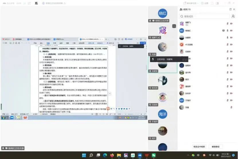 为切实做好我院“2025年国家社会科学基金高校思想政治理论课研究专项”申报工作,有效提升项目申报书撰写质量,10月27日晚,学院在线上召开国社科思政专项专题辅导会。学院院长刘爱军教授,陈宪良教授、白夜昕教授作为指导专家应邀出席,12位项目申报人参加辅导会,会议由学院副院长寇鹏飞主持。